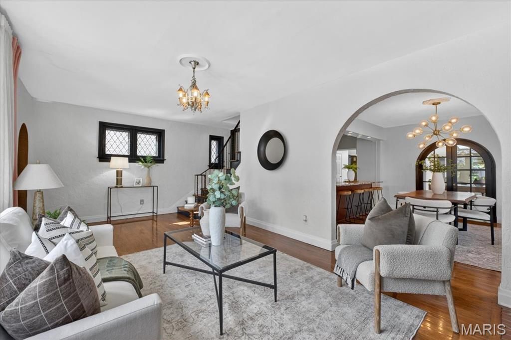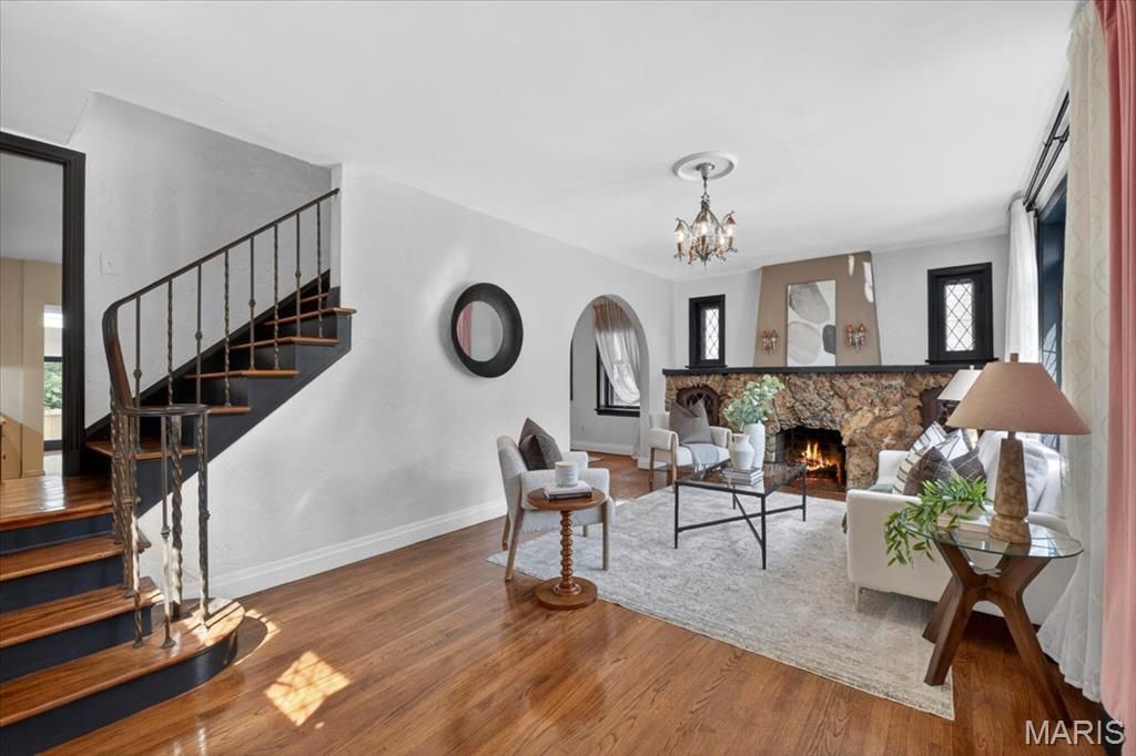 In the heart of Richmond Heights and the highly rated Clayton School District, this storybook 2.5 story Tudor blends timeless architecture with fresh modern flair. Arched doorways, hardwood floors, and two fireplaces set a warm, welcoming tone, while designer lighting and rich textures bring every room to life. The chef's kitchen wows with deep burgundy cabinetry, granite counters, and stainless appliances-open to the dining and sitting areas, perfect for cooking, conversation, and gatherings. Upstairs, you'll find two spacious bedrooms plus a flexible top-floor retreat ideal as a 3rd bedroom, studio, home office, or guest space. Updated baths feature artful tilework, a copper vessel sink, and vintage-meets-modern style. Enjoy morning coffee on the screened porch overlooking the fenced backyard oasis. From its arched-top front door to its new (2025) roof, this one-of-a-kind Tudor offers character, comfort, and convenience close to highways, parks, shops, and great restaurants.